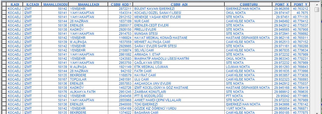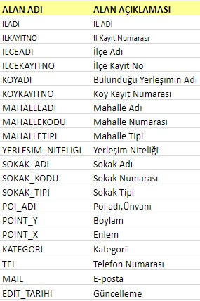 Her bir POI’nin Sokak, Cadde, Bulvar, Meydan, Mevkii, Mezra ve Küme evlerin bağlı olduğu köy ve mahalle ilişkisi ile verilmiştir.