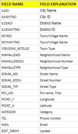 POI, İşyerleri, Firmalar, Marka Listeleri, Sektörel Rakip Listelerini içeren koordinat bilgisi ile haritalandırabilir datalardır.